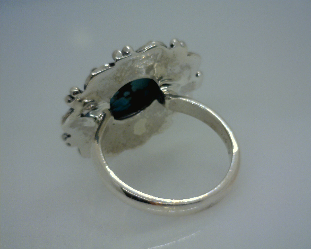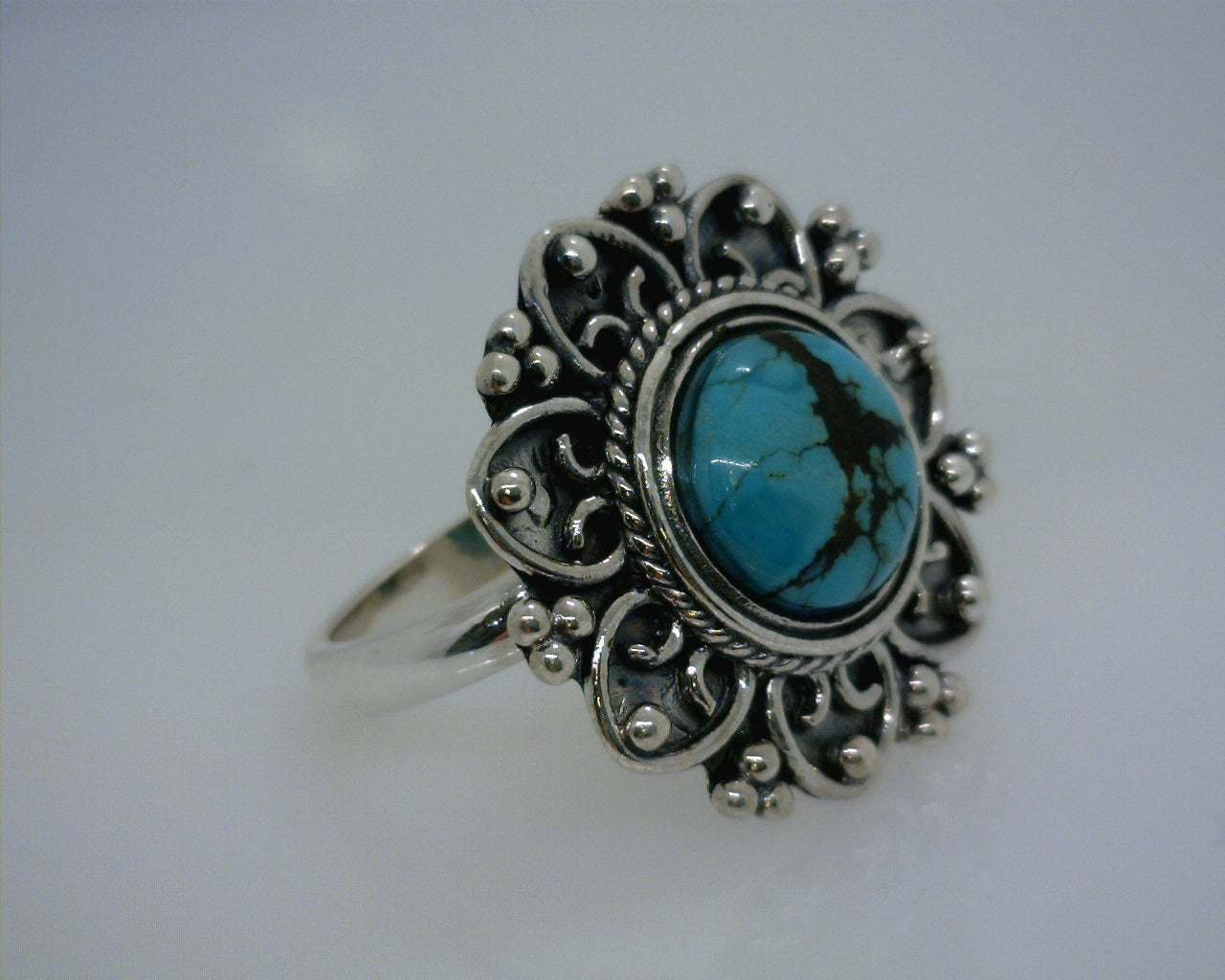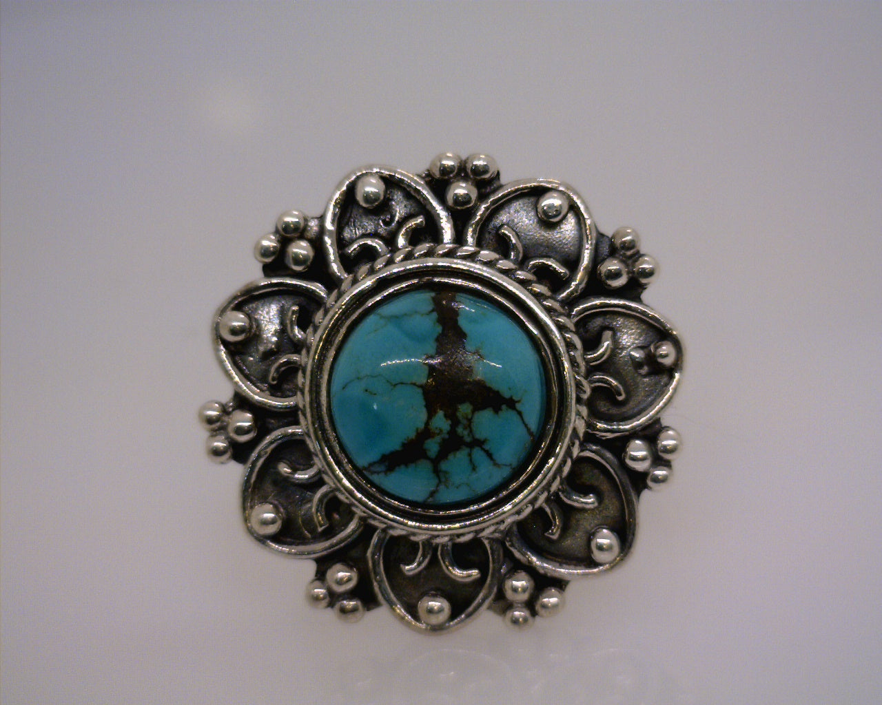 A sterling silver ring with a round turquoise set in the center and detailed flower design going around. Size 7