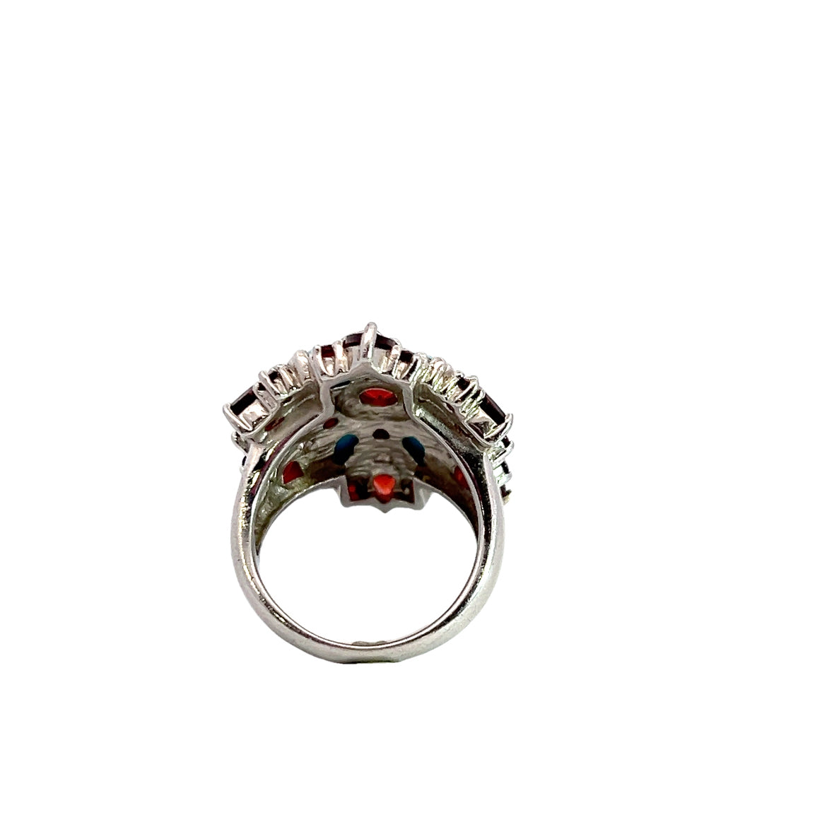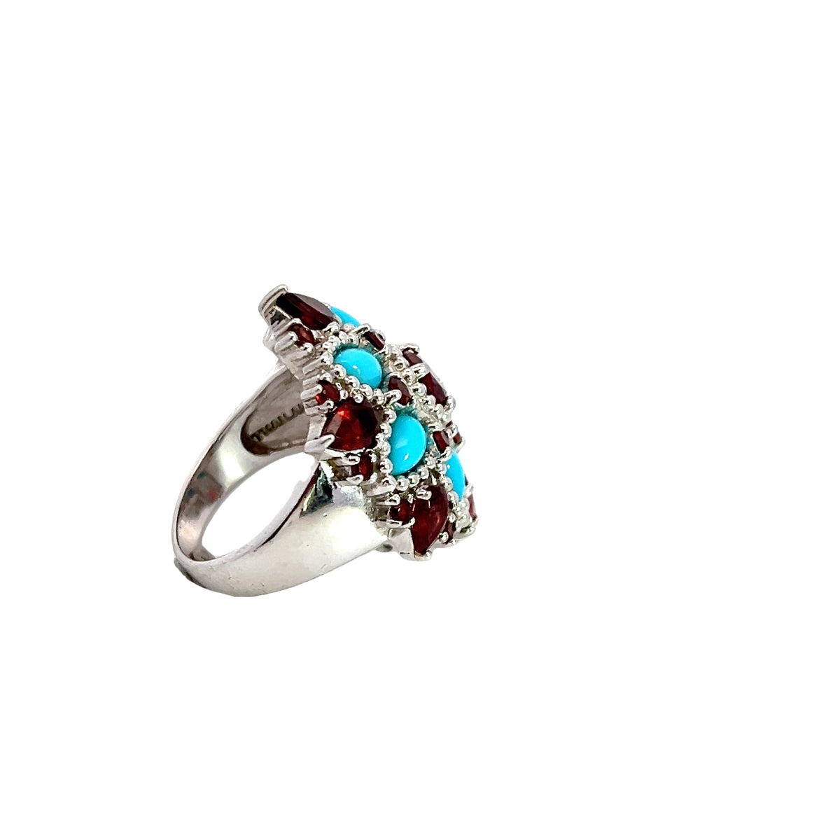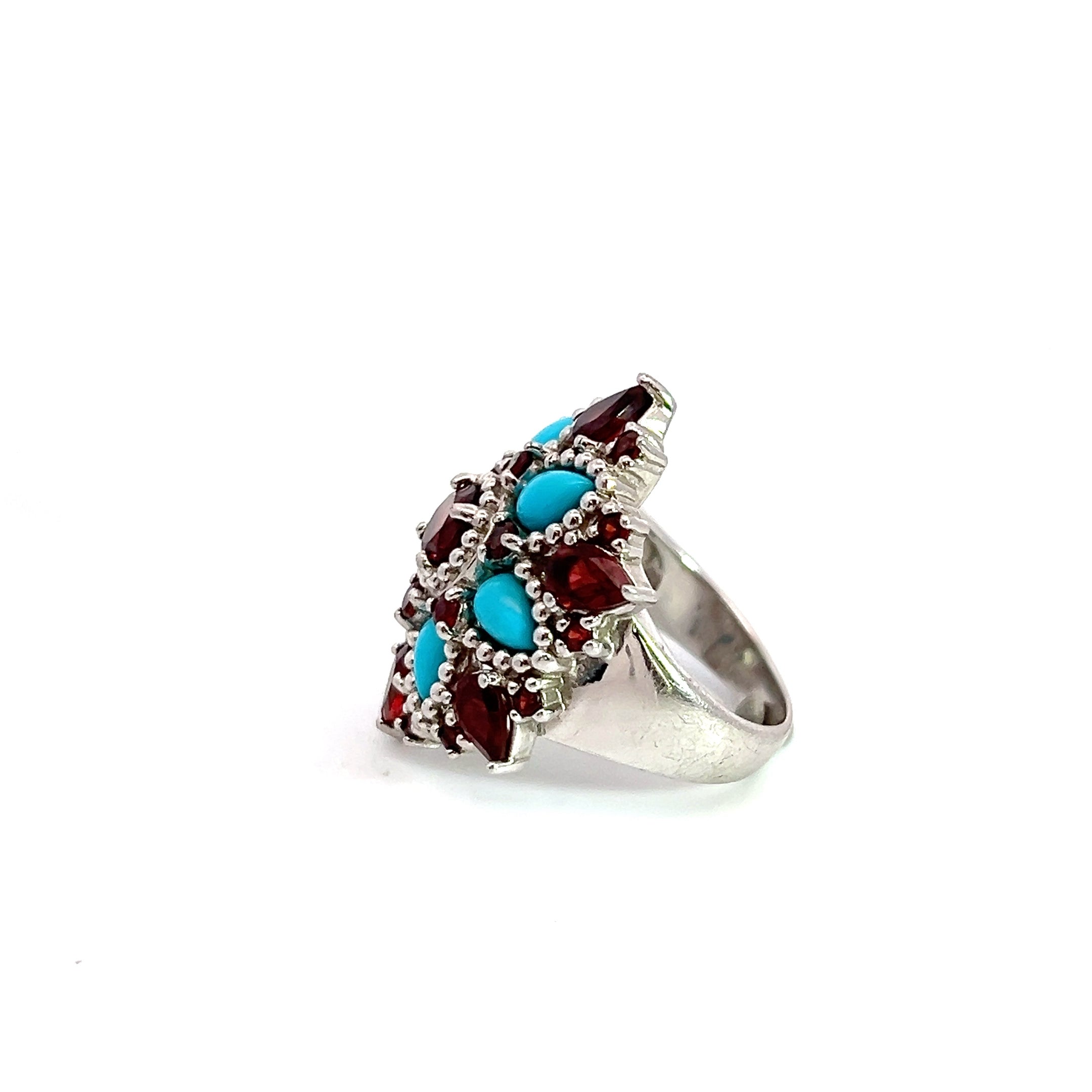 This estate sterling silver ring is a large star shape with blue pear shaped turquoise set around the round and pear shaped garnets. THe ring is 1.25" wide and a size 8