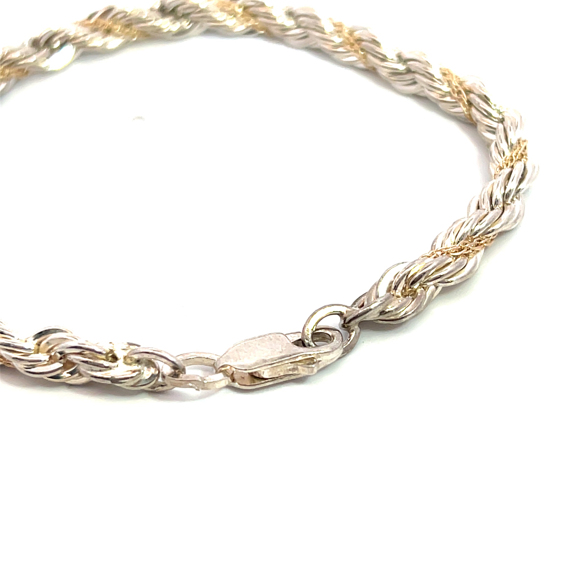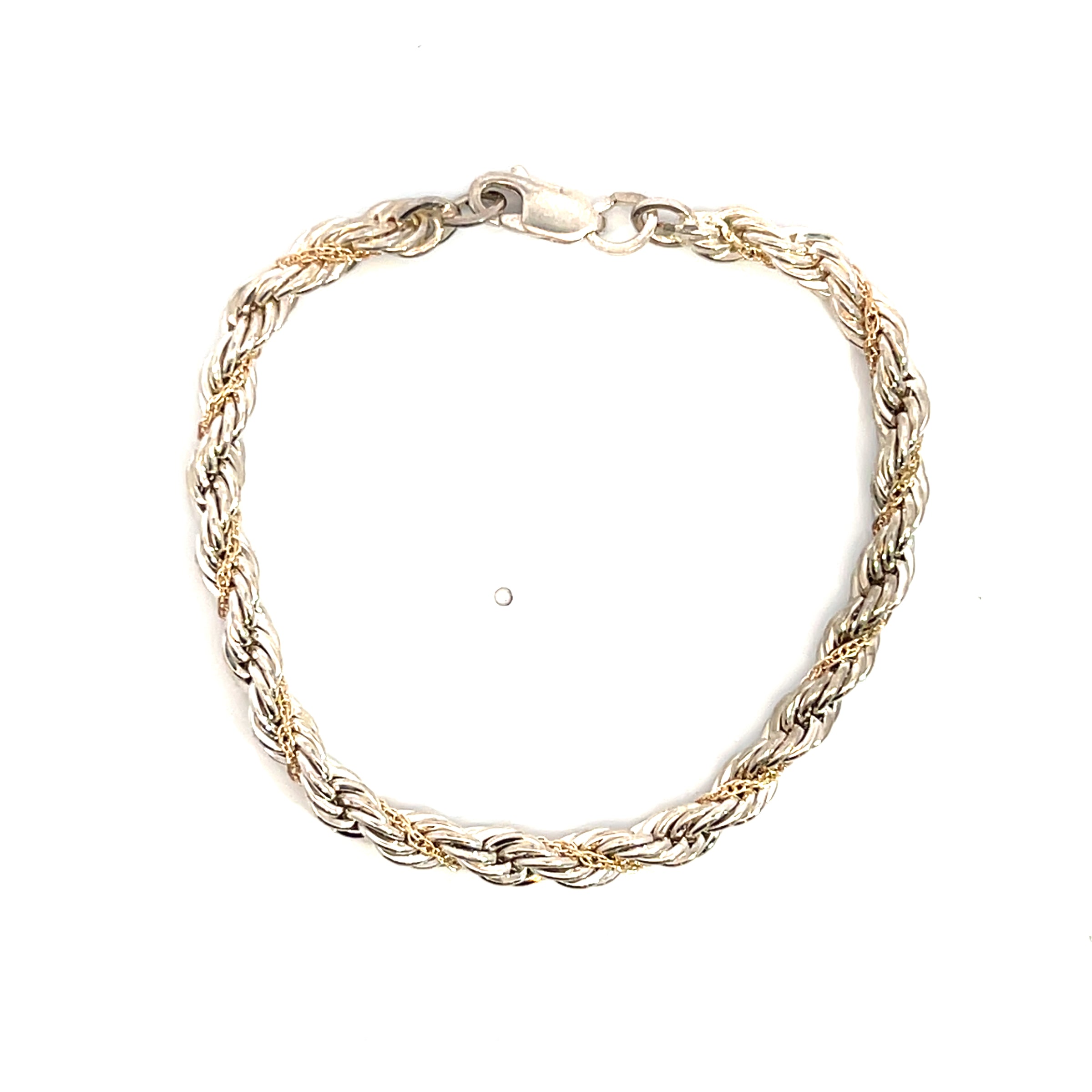 This estate bracelet is a twisted rope style bracelet with a gold plated chain wrapped through it. It is 4.75 mm wide and 7" long with a lobster clasp.