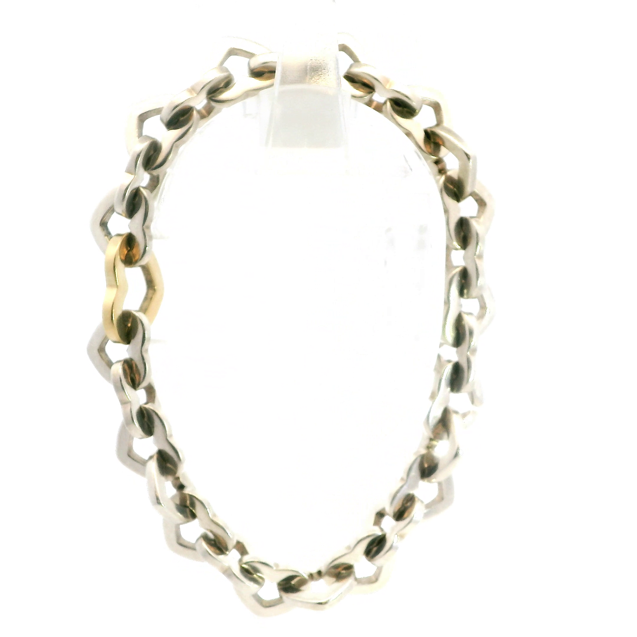 This Tiffany & Co. estate bracelet is the Heart Link style bracelet with sterling silver links and a 18k yellow gold link at the center. The bracelet is 7.5" long.