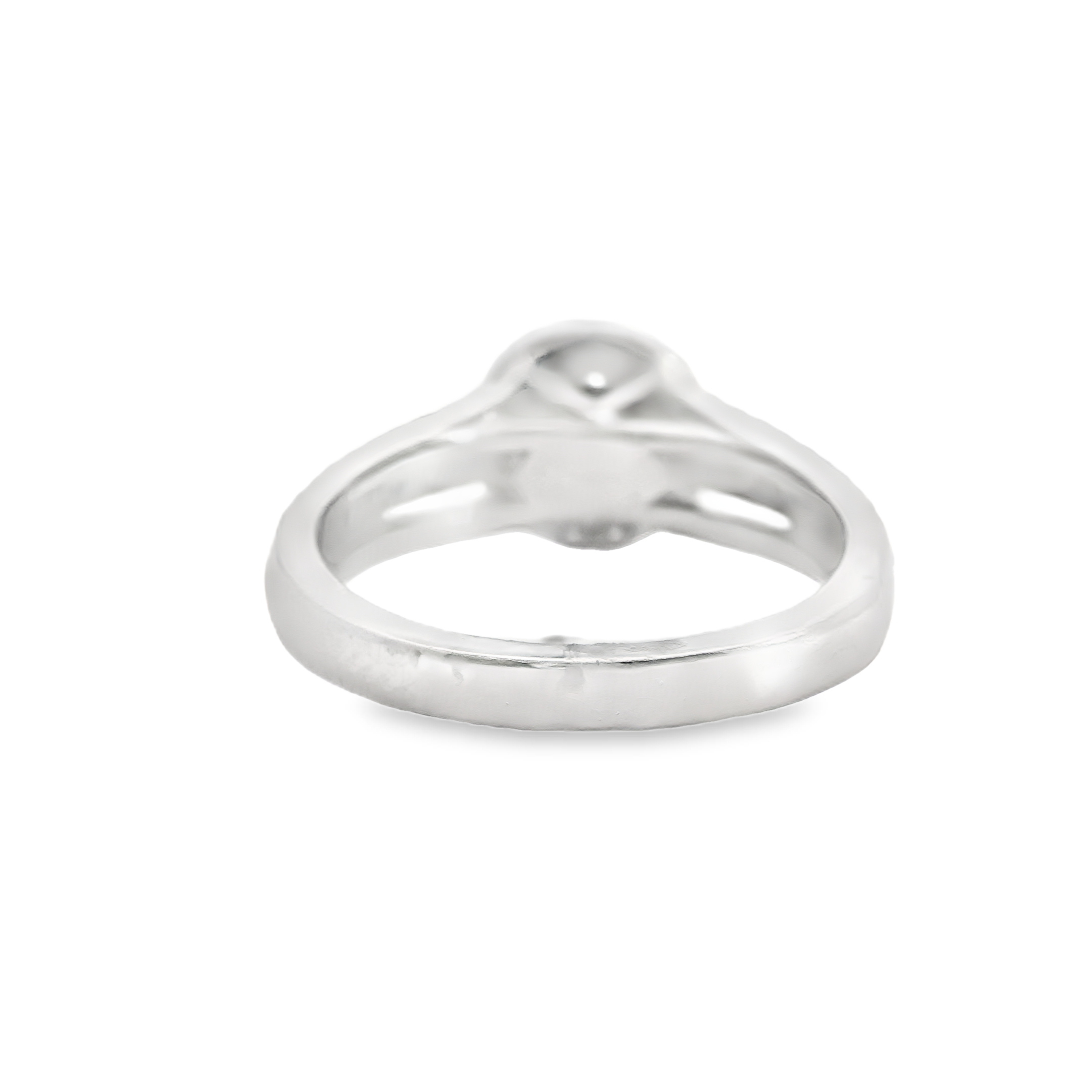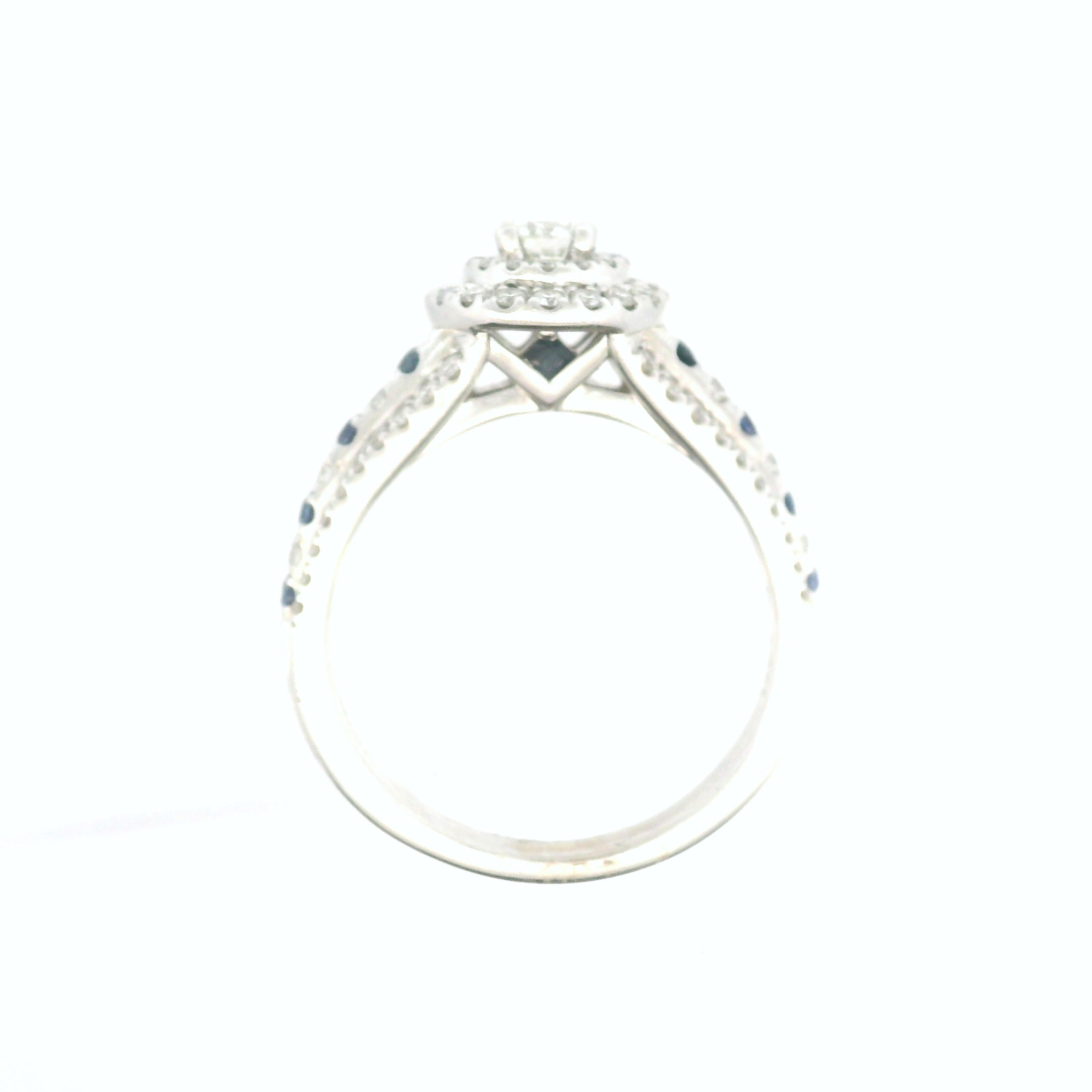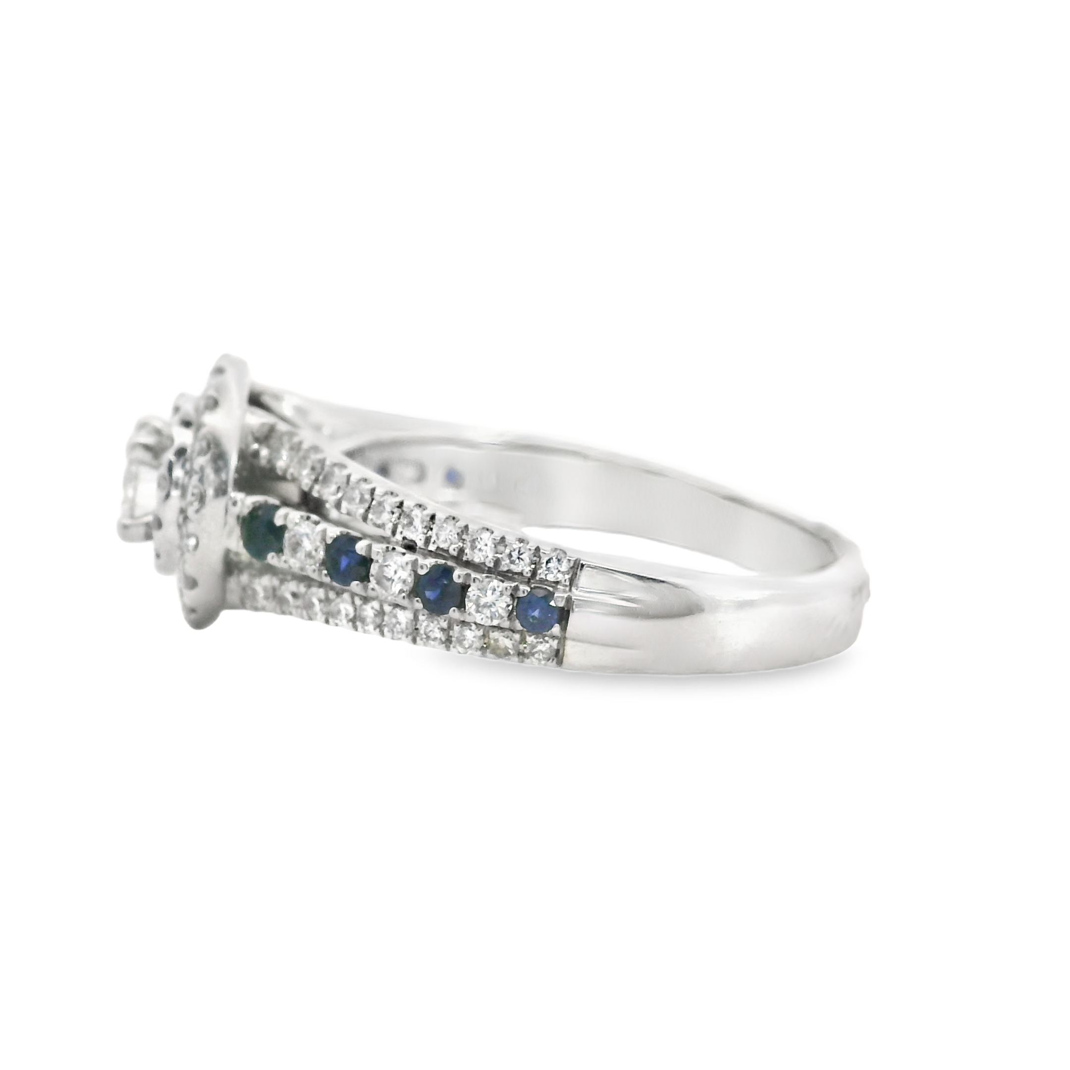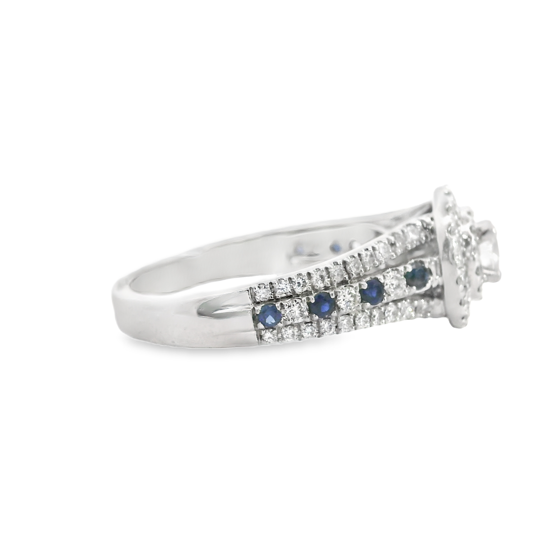 An estate Vera Wang Love diamond ring. The center diamond is 0.25 ct. That diamonds is surrounded by a double halo of diamonds. The band has 3 rows of stones, diamonds on the outside, and sapphires and diamonds on the middle row. The diamonds in the band total 0.88 ct tw. Size 8