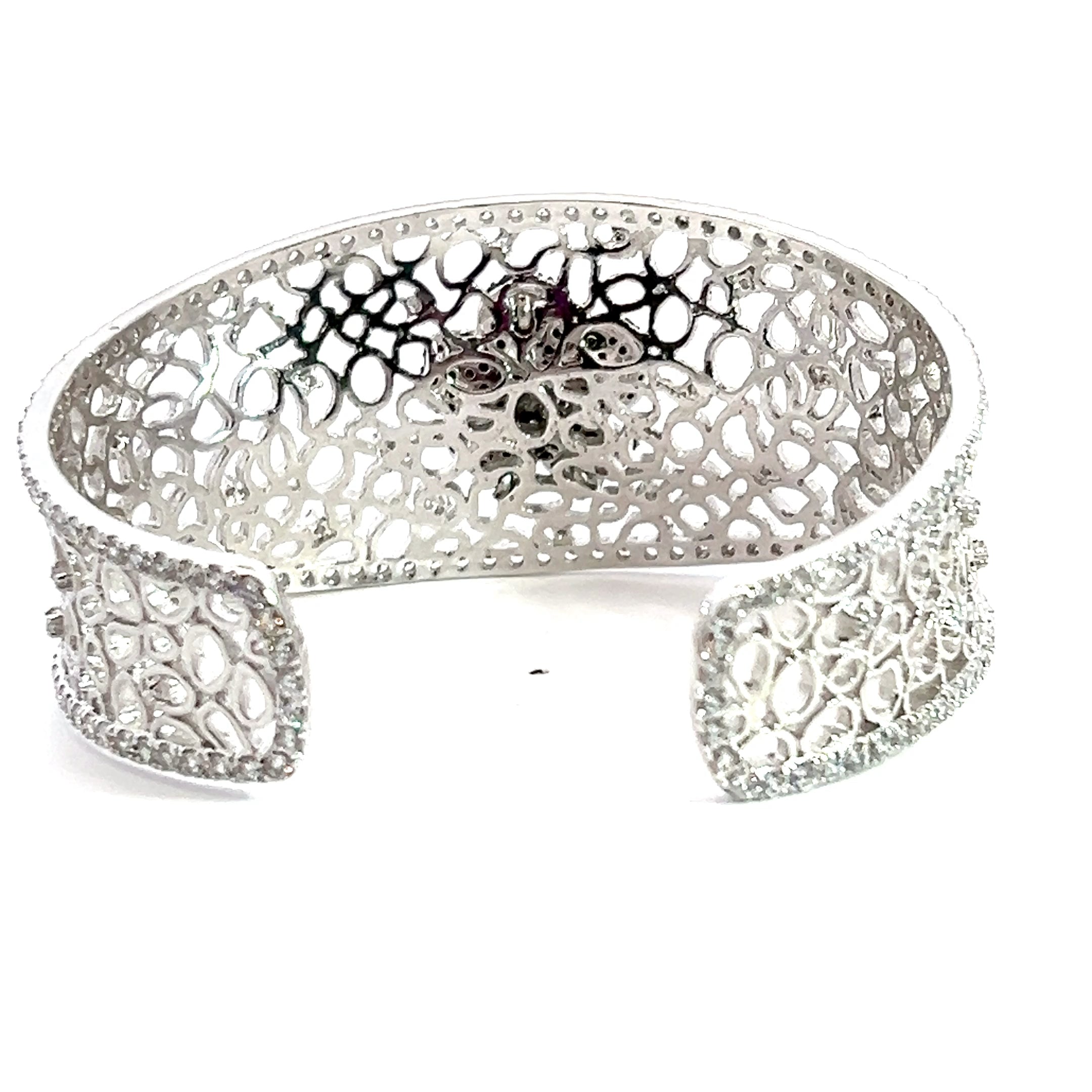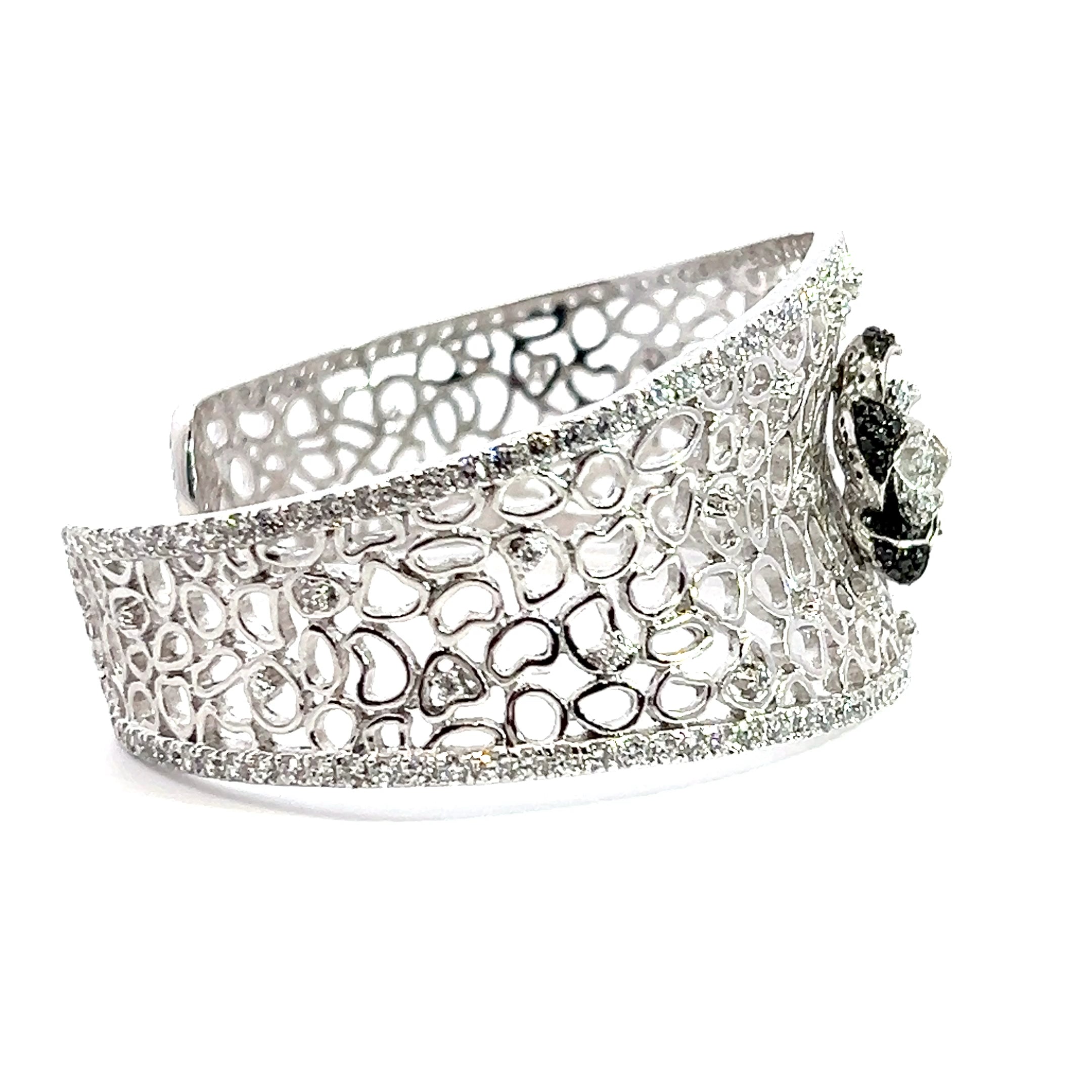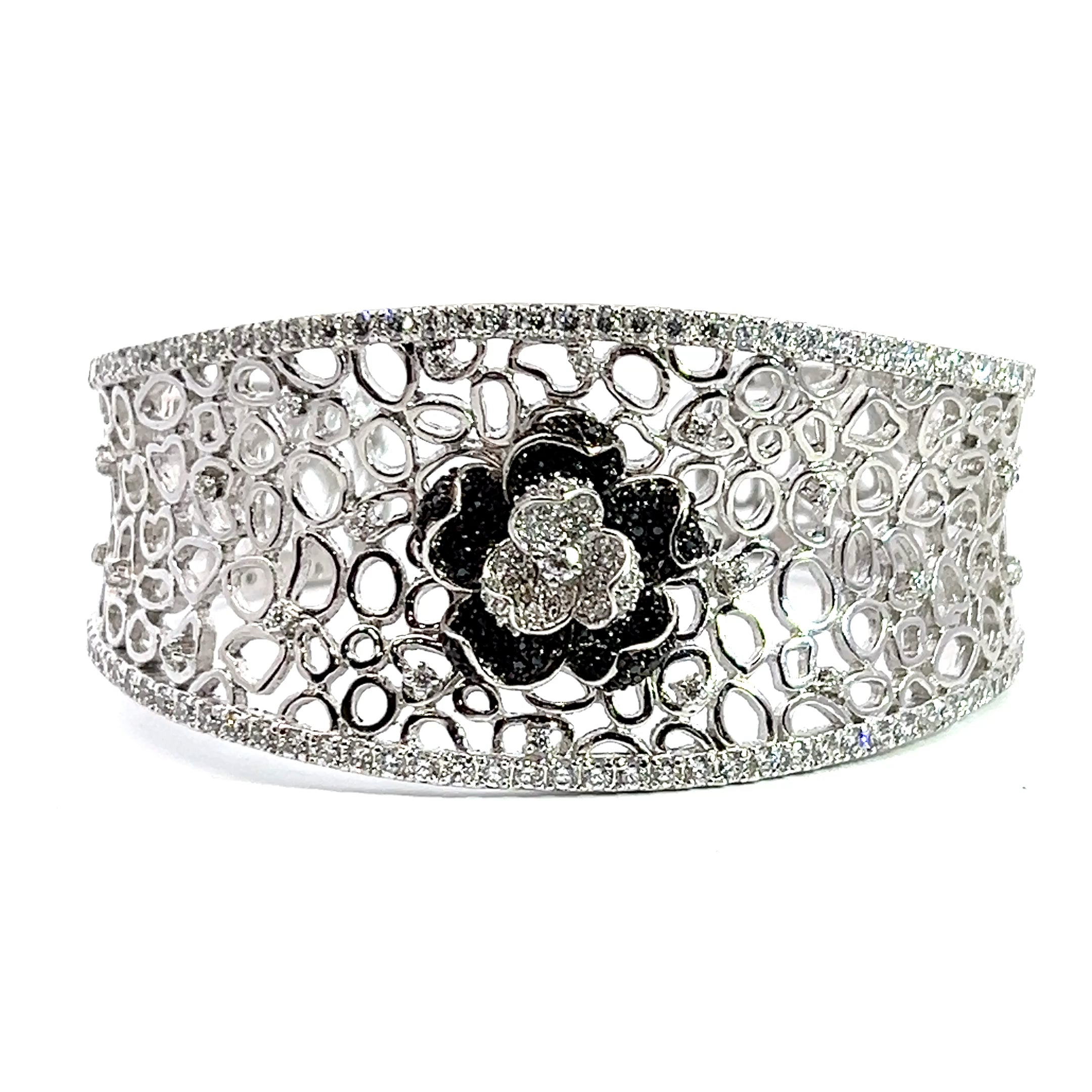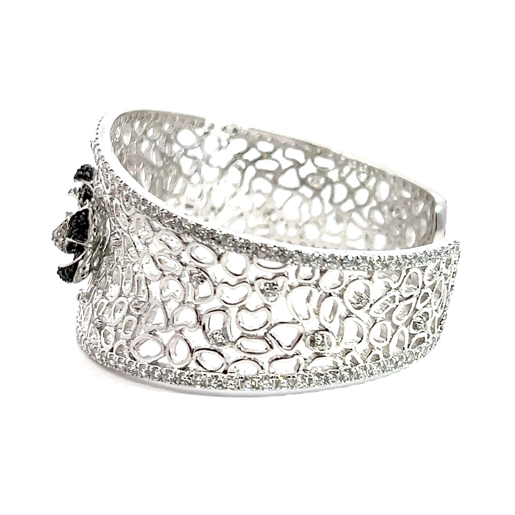 Sterling Silver Black & White CZ Flower Bangle Bracelet 1.25" Wide