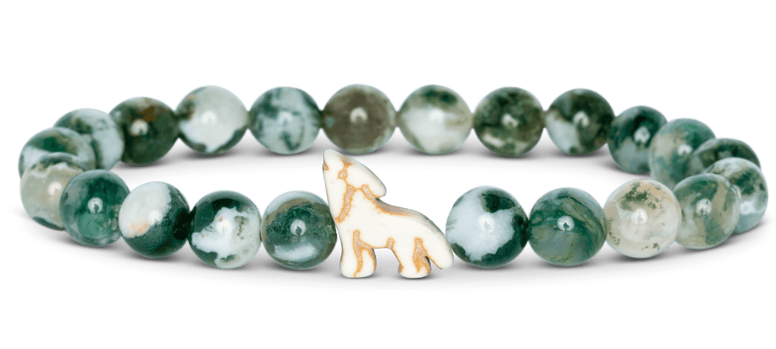 This stretch Fahlo bracelet in woodland green with wolf center detail comes with it's own real live wolf to track!